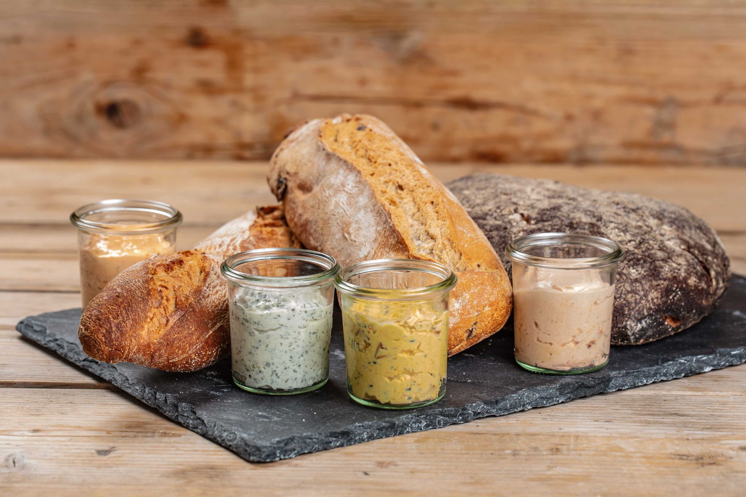 Neu in unserem Sortiment: Individuell zusammen gestellte Brotkörbe – ganz nach Ihren Wünschen. Passend dazu: leckere selbstgemachte Dips von vegetarisch bis vegan.